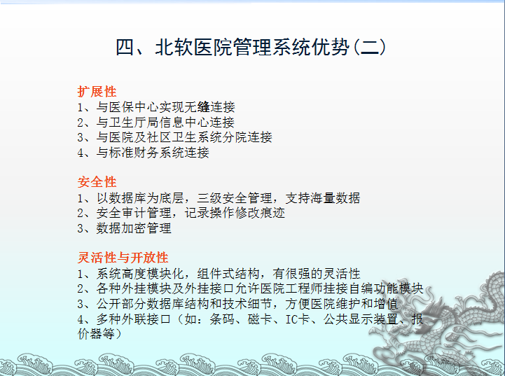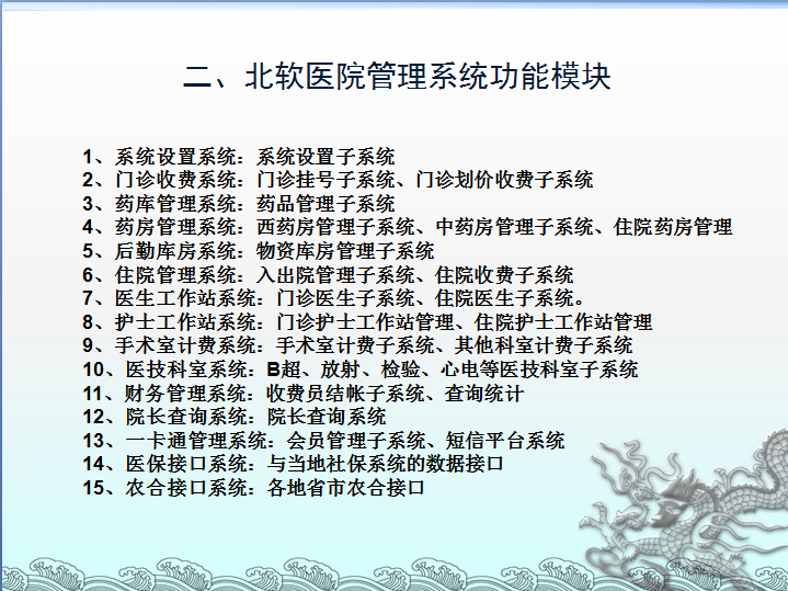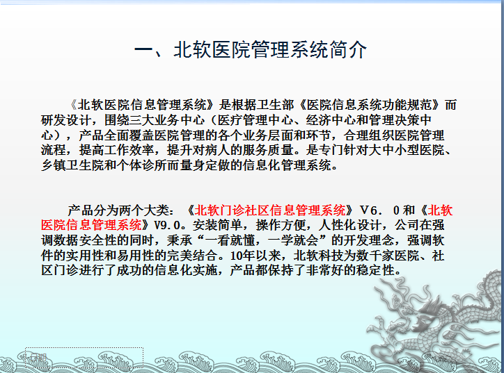 《北軟醫(yī)院信息管理系統(tǒng)》9.0版(XRHIS v9.0)包括門診信息管理系統(tǒng)、住院信息管理系統(tǒng)、藥庫藥房信息管理系統(tǒng)、門診藥房管理系統(tǒng)、住院藥房管理系統(tǒng)、病案管理系統(tǒng)、院長查詢管理系統(tǒng)、財務(wù)信息管理系統(tǒng)、社保(農(nóng)合,醫(yī)保,保險,財務(wù))接口系統(tǒng)