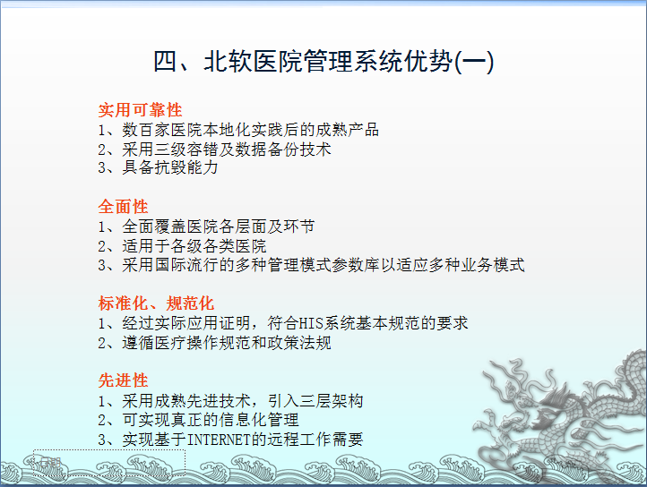 《北軟醫(yī)院信息管理系統(tǒng)》集眾家之所長,設(shè)計出一套高效的醫(yī)院信息管理體系,成功地提出了醫(yī)院的現(xiàn)金流、實物流、病人流、醫(yī)囑流等全方位管理的完整解決方案,體現(xiàn)了一種全新的醫(yī)院管理思想。具體設(shè)計圍繞著醫(yī)院管理的三個層次需求展開,即醫(yī)院管理層、業(yè)務(wù)管理層和業(yè)務(wù)操作層。