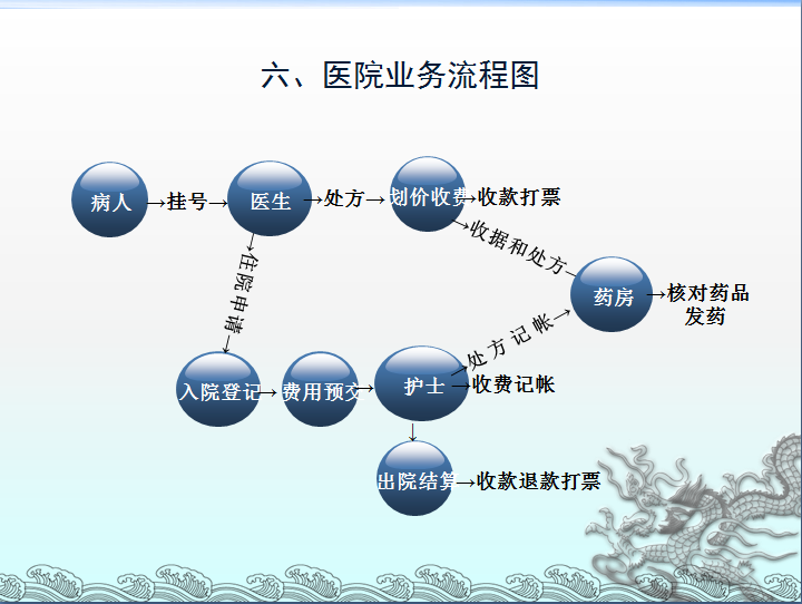 住院管理子系統(tǒng):入/出院管理子系統(tǒng)、住院收費(fèi)子系統(tǒng)、病床管理子系統(tǒng)