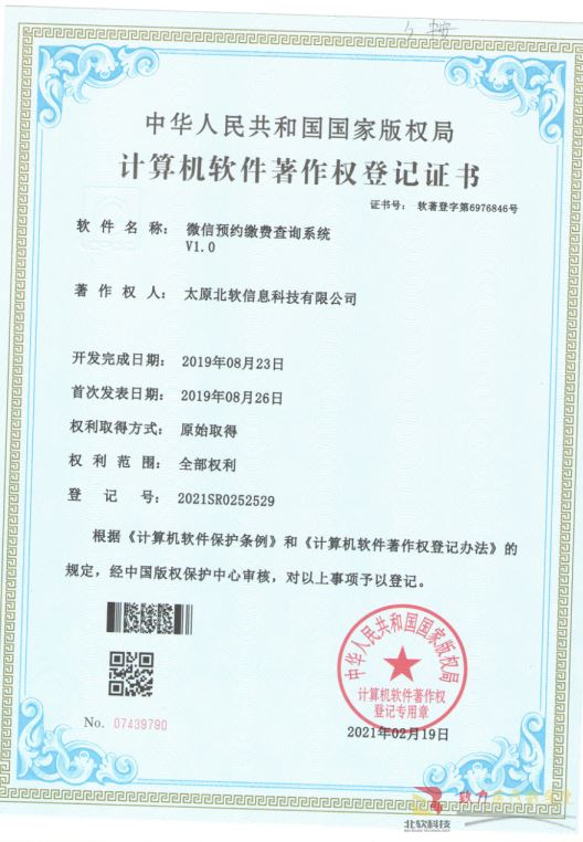 熱烈祝賀公司獲得《微信預約繳費查詢系統》軟件著作權!
